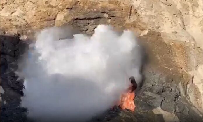 Το βίντεο δείχνει τη γυναίκα, να κάθεται σε έναν βράχο, χωρίς να έχει αντιληφθεί τον όγκο νερού που υψωνόταν, σκάει πάνω της και την παρασύρει στη θάλασσα.
