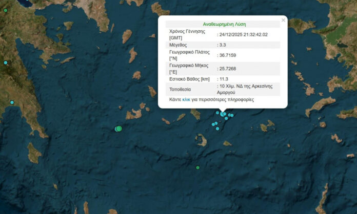 Ασθενής σεισμική δόνηση μεγέθους 3,3 βαθμών της κλίμακας Ρίχτερ, σύμφωνα με την αναθεωρημένη λύση του Γεωδυναμικού Ινστιτούτου του Αστεροσκοπείου Αθηνών, σημειώθηκε το βράδυ της Παραμονής των Χριστουγέννων, στις 23:32 σε υποθαλάσσια περιοχή, κοντά στην Αμοργό.
