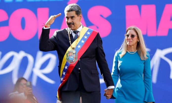 Ο πρόεδρος Νικολά Μαδούρο ρίχνει ένα καρότο δίπλα στη σύζυγό του Σίλια Φλόρες κατά τη διάρκεια συγκέντρωσης για τον εορτασμό της επετείου της μάχης της Σάντα Ινές, που έλαβε χώρα κατά τη διάρκεια του Ομοσπονδιακού Πολέμου της Βενεζουέλας τον 19ο αιώνα, στο Καράκας της Βενεζουέλας, την Τετάρτη 10 Δεκεμβρίου 2025