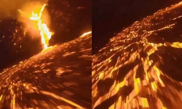 Τα πλάνα δείχνουν τις φωτεινές ροές να διασχίζουν το σκοτεινό ηφαιστειακό έδαφος, χωρίς ωστόσο να απειλούνται κατοικημένες περιοχές