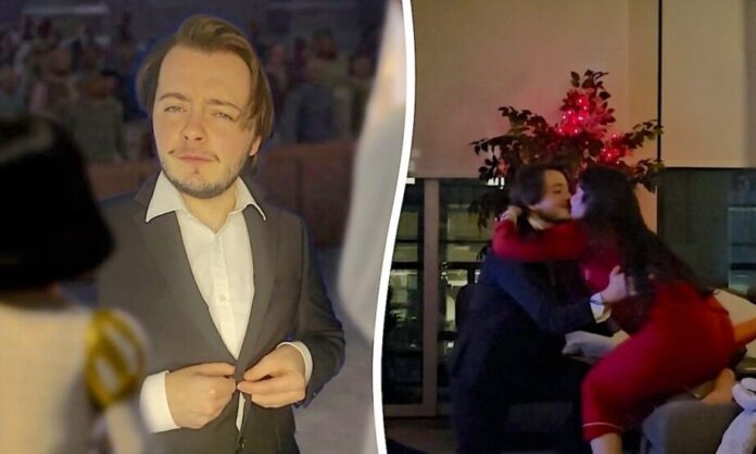 Μάλιστα, δεν είχε αρκετό χρόνο για να αλλάξει πλήρως και σκέφτηκε να… παραλείψει τις κάλτσες, αλλά τελικά όλα πήγαν καλά και απέσπασε το πολυπόθητο «ναι». Στήριξε επίσης το κινητό του τηλέφωνο για να καταγράψει τη στιγμή και παρ’ ότι σκόνταψε στον δρόμο, ευτυχώς η γυναίκα ήταν απορροφημένη στην ταινία.