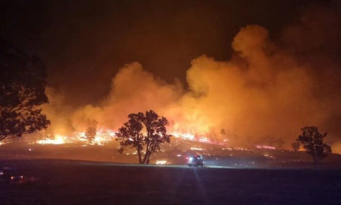 Φωτογραφίες που τραβήχτηκαν νωρίτερα αυτή την εβδομάδα δείχνουν τον νυχτερινό ουρανό να λάμπει με μια πορτοκαλί λάμψη καθώς οι φλόγες κατέστρεφαν θαμνώδεις εκτάσεις.