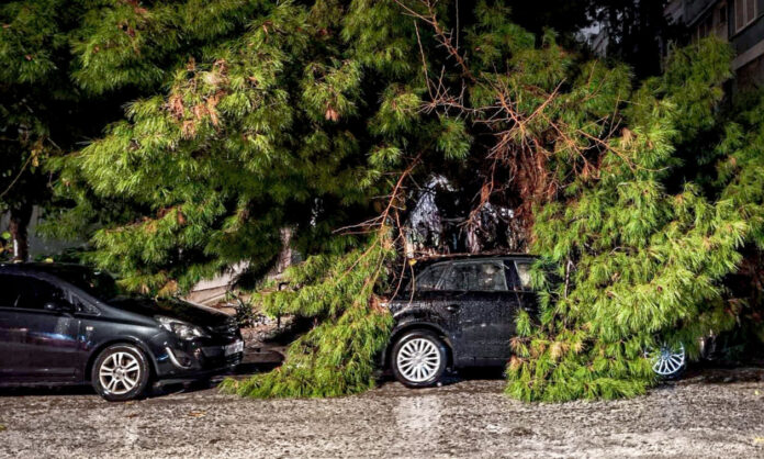 Λύγισε μεγάλο δέντρο στον Νέο Κόσμο από την κακοκαιρία και καταπλάκωσε σταθμευμένα αυτοκίνητα