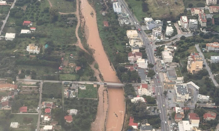 Πλημμυρισμένες εκτάσεις, φουσκωμένα ρέματα, αλλά και φερτά υλικά που κατέληξαν στη θάλασσα, αλλάζοντάς της χρώμα.