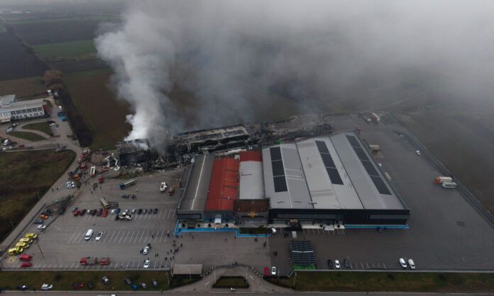 Συγκλονιστικές πανοραμικές εικόνες της καταστροφής από την έκρηξη και τη φωτιά στο εργοστάσιο της βιομηχανίας μπισκότων «Βιολάντα», στα Τρίκαλα.