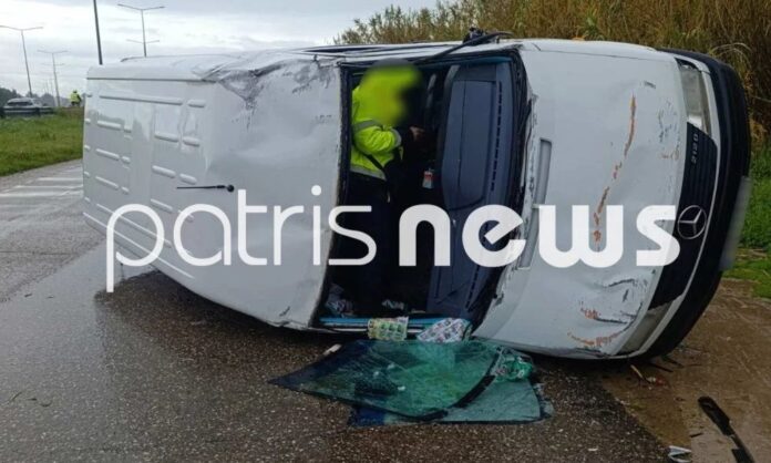 Το βαν εξετράπη της πορείας του, ανετράπη και κατέληξε δεξιά στη βοηθητική οδό.