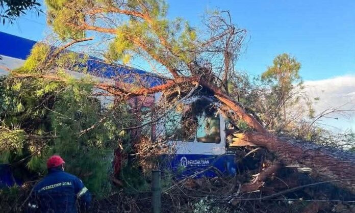Επικίνδυνο περιστατικό σημειώθηκε το πρωί της Τρίτης (27/01) στην Ηλεία, όταν κατά τη διέλευση τρένου που εκτελούσε το δρομόλογιο Πύργος – Κατάκολο, μεγάλο πεύκο έπεσε αιφνιδιαστικά πάνω στο βαγόνι του μηχανοδηγού, στο ύψος του Αγίου Κωνσταντίνου, προκαλώντας υλικές ζημιές και τον τραυματισμό του οδηγού.