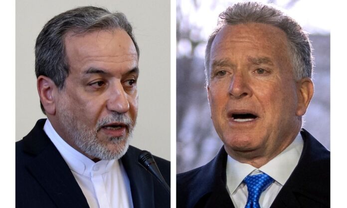 ΑΡΧΕΙΟ – Σε αυτή τη φωτογραφία που δημοσιεύθηκε από το Υπουργείο Εξωτερικών του Ιράν, ο υπουργός Εξωτερικών του Ιράν, Abbas Araghchi (αριστερά, στο προσκήνιο), υποδέχεται στις 11 Μαΐου 2025 έναν ανώνυμο αξιωματούχο του Ομάν (στο κέντρο) κατά την άφιξή του στη Μασκάτη, Ομάν, για να διαπραγματευτεί με τον αμερικανό απεσταλμένο για τη Μέση Ανατολή, Steve Witkoff, ενώ ο πρέσβης του Ιράν στο Ομάν, Mousa Farhang, περπατά στα δεξιά.