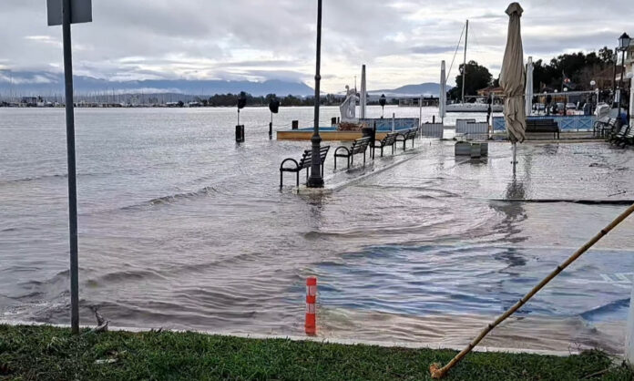 Στην Πρέβεζα η άνοδος της στάθμης των υδάτων, στην οποία συνέβαλαν και οι βροχοπτώσεις, ανέβασε τη θάλασσα στη στεριά, με το νερό να καλύπτει το παραλιακό μέτωπο στην περιοχή της «Γοργόνας», φτάνοντας μέχρι το οδόστρωμα.