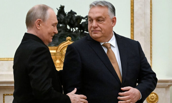Ο Ρώσος πρόεδρος Βλαντιμίρ Πούτιν και ο Ούγγρος πρωθυπουργός Βίκτορ Όρμπαν κατά τη συνάντησή τους στο Παλάτι της Γερουσίας του Κρεμλίνου στη Μόσχα, Ρωσία, την Παρασκευή 28 Νοεμβρίου 2025.