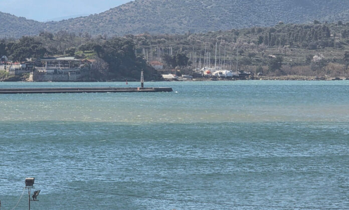 Μια μεγάλη καφέ κηλίδα εμφανίστηκε την Τετάρτη στο λιμάνι του Βόλου, η οποία εκτείνεται από το σημείο που «δένει» το πλοίο για τις Σποράδες, μέχρι μπροστά στην παραλία της πόλης.