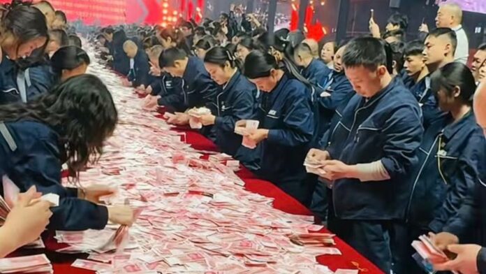 Πρωτοφανείς εικόνες εκτυλίχθηκαν στο ετήσιο πάρτι της κινεζικής εταιρείας κατασκευής γερανών Henan Kuangshan Crane, καθώς η διοίκηση στοίβαξε 26 εκατομμύρια δολάρια σε μετρητά πάνω σε 800 τραπέζια της εκδήλωσης.