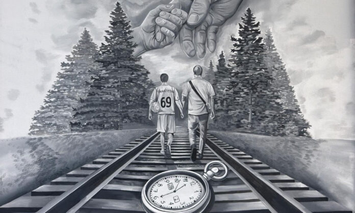 Η τοιχογραφία απεικονίζει έναν πατέρα να κρατάει τον γιο του από το χέρι και να περπατούν πάνω σε σιδηροδρομικές ράγες ενώ ένα ρολόι δείχνει την ώρα που σημειώθηκε το τραγικό δυστύχημα.