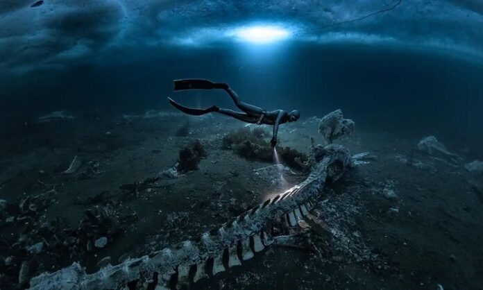 «Αισθάνεσαι ότι όλα αυτά τα πλάσματα της αβύσσου σε κοιτάζουν από κάτω», περιγράφει ο ίδιος. Όταν τα μάτια του προσαρμόστηκαν στο μπλε φως της παγωμένης «κρύπτης», αντίκρισε το απόκοσμο θέαμα: τα λείψανα περίπου 20 φαλαινών minke διασκορπισμένα σε βάθος μόλις πέντε μέτρων. Η λήψη του, με τίτλο “Whales Bones”, του χάρισε τον τίτλο του «Υποβρύχιου Φωτογράφου της Χρονιάς 2024».